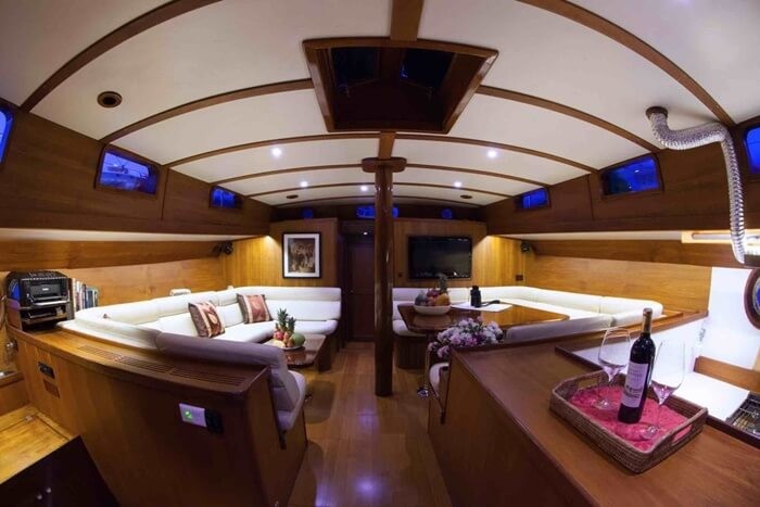 There are two guest cabin on the lower deck. The first one is adjacent to the Owner’s suite and the bathroom is on the other of the boat. The other one is on the other side of the saloon and also comes with a separate bathroom.