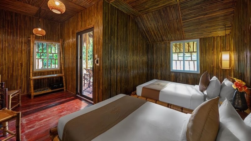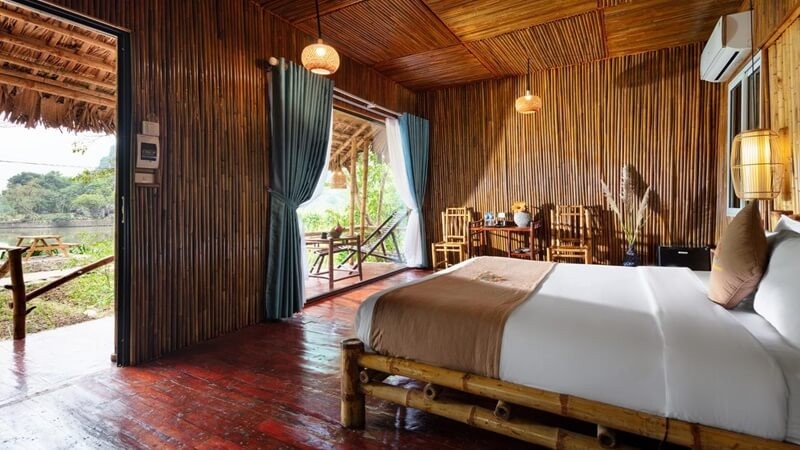 We stayed here for 1 night as part of our Family tour of Vietnam with 2 adults and 4 children. A shame we were booked in for only 1 night because it was amazing! The bungalows are set in the middle of lush vegetation and mountains, the garden is lovely and the rooms are spacious, clean and fully equipped. The food in the restaurant is beautiful and fresh and all the staff are super friendly.