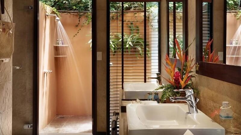 Overlooking a lush garden, this room features a private balcony, a wooden sofa and a table. The modern bathroom comes with a shower, separate toilet as well as his and her sink. Bathroom amenities are offered. There is no capacity for extra beds.