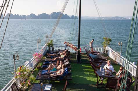 In the afternoon, we pay a visit to some of the most magical caves of Halong. You will be astonished by the very animated and splendid beauty which is made from stalactites and stalagmites. Set your mind free and enjoy the peace of the magnificent bay. Refresh yourself in the pure emerald water as the ship stops en route. You can also opt to row kayak to enjoy the tropical vibe in this paradise.
